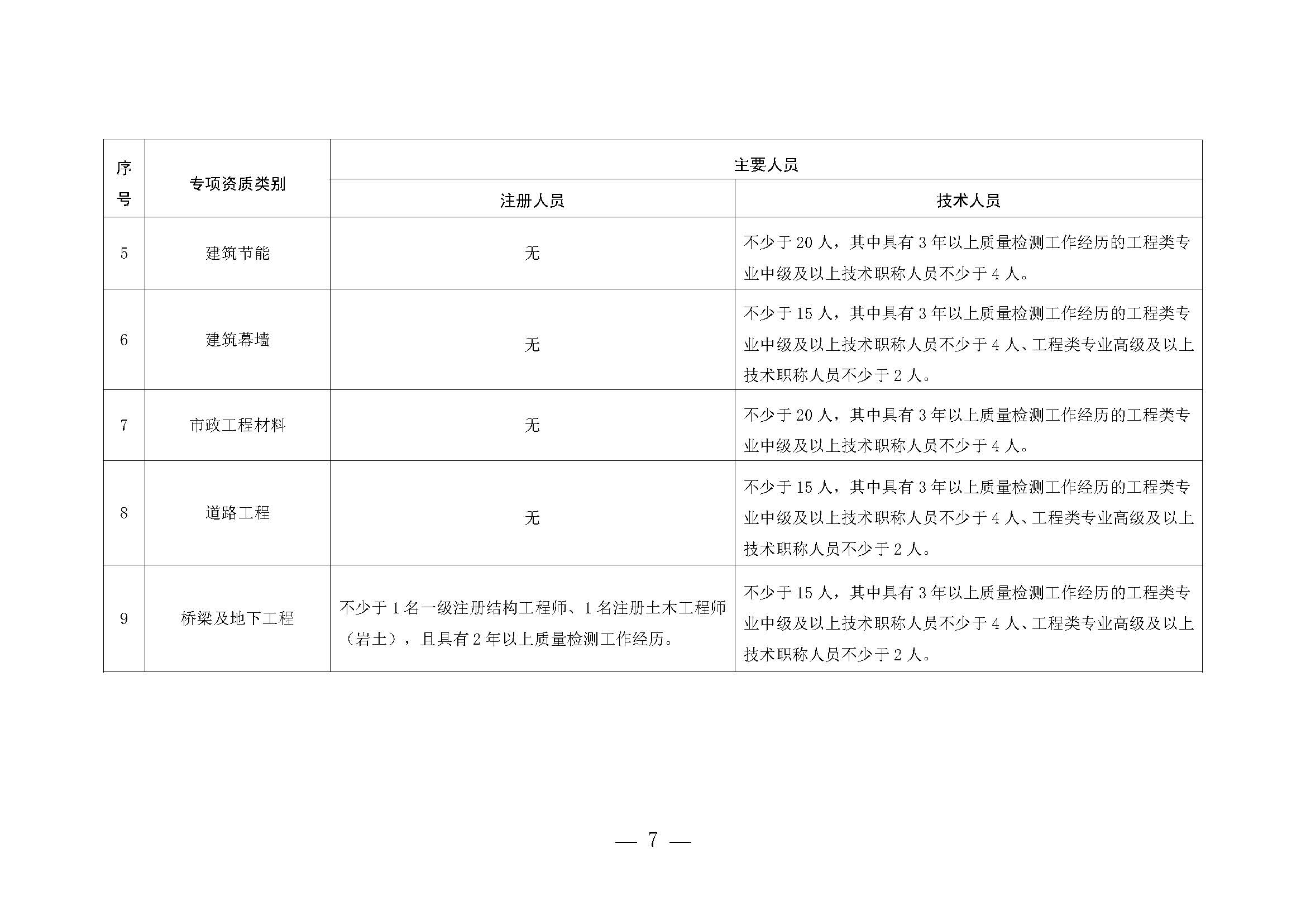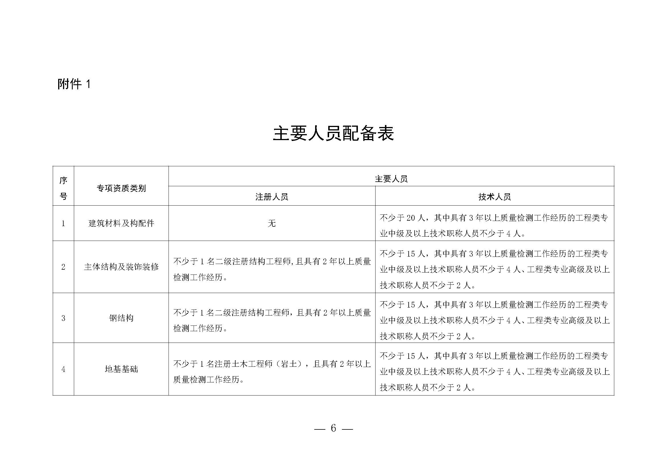 (1)技(ji)術負責(ze)人(ren)應具(ju)有(you)工程(cheng)類專業(ye)正高級(ji)技術(shu)職(zhi)稱(cheng),質量負(fu)責(ze)人應具(ju)有(you)工程類(lei)專業高(gao)級(ji)及(ji)以(yi)上技術(shu)職稱,且均具有(you) 8 年以上質量(liang)檢測工作(zuo)經(jing)歷(li)。